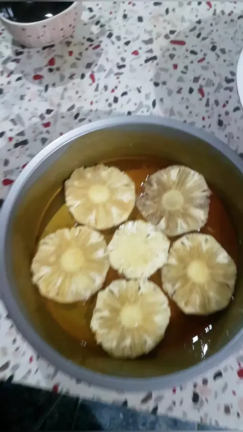 COLOCAR AS RODELAS DE ABACAXI NA FORMA POR CIMA DA CALDA DE ACUCAR #umadelícia #bolo #Gastronomia #confeitaria