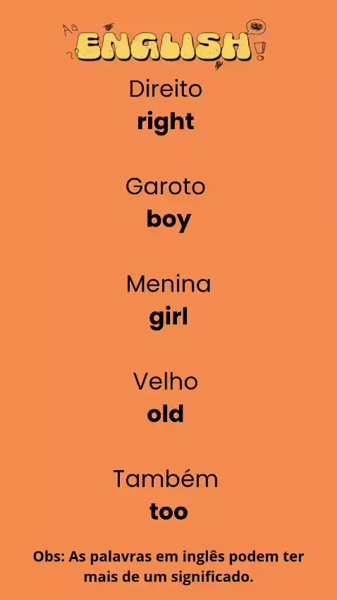 Curso de Inglês. Português - Inglês, 36: Direito right Garoto boy Menina girl Velho old Também too #ingles #aprender #curso