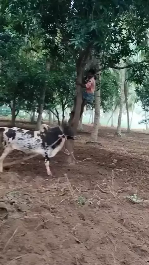 VACA BRAVA COLOCOU HOMEM PRA SUBIR EM ÁRVORE #VACA #vacabrava #vacanaindia #fazenda