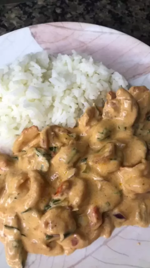 Strogonoff de camarão. Ingredientes: Azeite 400 g de camarão 1 cebola 3 dentes de alho 1 metade de um tomate 1 pimenta de cheiro Cheiro verde 1 colher de extrato de tomate 1 colher de requeijão 1 colher de mostarda 1 Creme de leite Temperos ( Noz-moscada, Lemon pepper, Aji-no-moto).