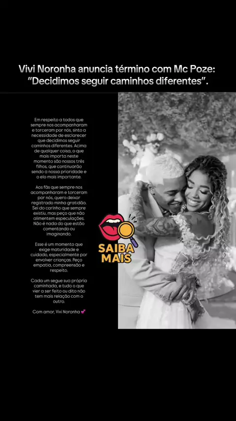 Vivi Noronha anunciou nas redes sociais o término de seu relacionamento com Mc Poze. Em comunicado, ela afirmou que a decisão foi tomada em conjunto e que os três filhos do casal continuarão sendo a prioridade dos dois. A influenciadora agradeceu o carinho dos fãs, pediu que não criem especulações sobre o motivo da separação e destacou que o momento exige “maturidade”, empatia e respeito”. ACABOU! 📸💔 #termino #vivinoronha #poze #polemica #viral