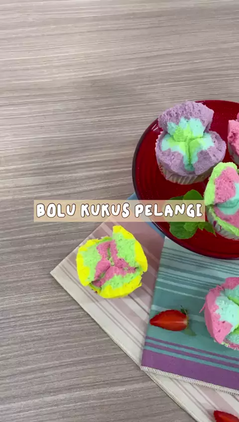 BOLU KUKUS RAINBOW Bahan: 2 btr telur 200 gr gula pasir 1 sdt emulsifier (sp/tbm) 200 gr tepung protein sedang 125 ml susu cair Pewarna merah Pewarna hijau Pewarna kuning Pewarna biru Pewarna ungu Pewarna orange air jeruk nipis tusuk gigi Cara membuat: 1. Campur semua bahan jadi satu, kocok dengan kecepatan tinggi selama 10 menit. 2. bagi menjadi 6 bagian. masing-masing tambahkan 2-3 tetes pewarna. aduk rata. 3. Tuang adonan bergantian dicetakan bolu kukus yang sudah diberi cup kertas hingga pe...