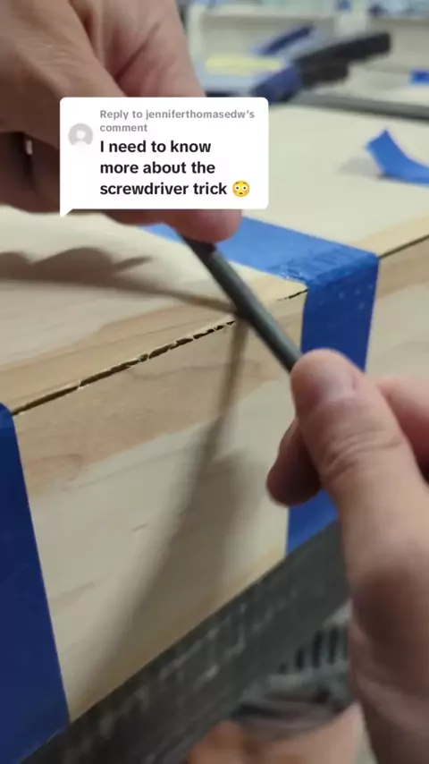 Respondendo ao truque da chave de fenda explicado!! Tão útil para juntas de mitradas longas quando você simplesmente não consegue aperfeiçoá-las. # learnwoodworking # woodworkingtips # woodworkingtipsandtricks # diyfurnituretips # learnwoodworking # miteredcorners # miterededdges