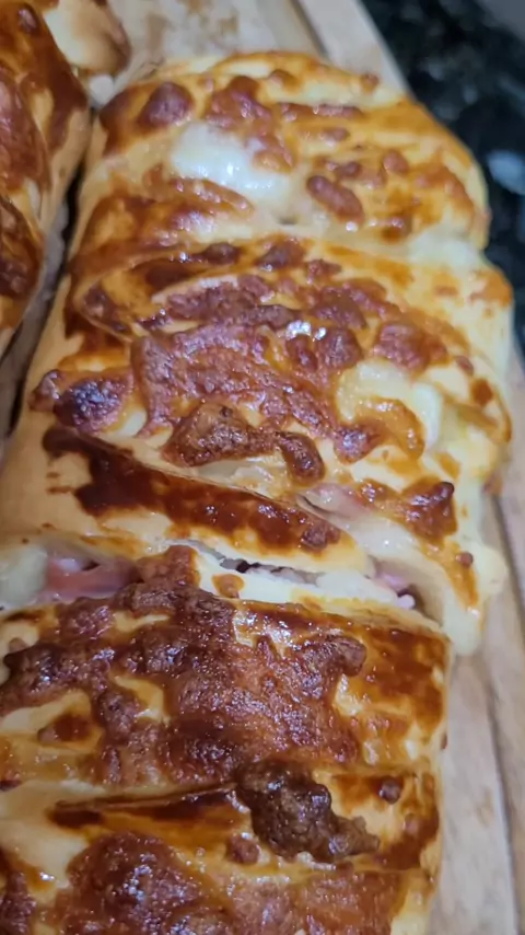 Siga @senta_quelavemreceita INGREDIENTES: • 500g de farinha de trigo • 240 ml de água morna • 1 colher de margarina • 5 g de fermento seco • 2 colheres de açúcar • 1 colher (de café) de sal MODO DE PREPARO: Sove bem a massa por cerca de 10 minutos, até ela ficar lisa e elástica. Deixe descansar por 40 minutos RECHEIO: 250g presunto 250g mussarela Pincele gemas de ovo e leve ao forno pré-aquecido a 200 °C por 30 minutos #receitafacil #receitapratica #Salgado #receitaviral