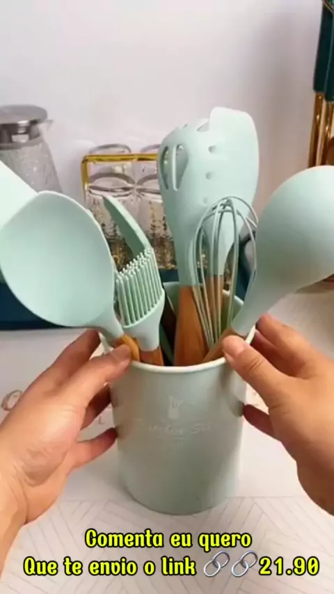 Jogo de Cozinha Kit com 5pcs ou/ 12 Peças de Silicone, Utensílios e Copo Suporte para Cozinha Cabo de Madeira# comenta eu quero que te envio o link 🔗#utencilios #cozinha✅️ #colheresdesilicone #kitutenciliosdecozinhasilicone12peças #achadinhosdashoppe