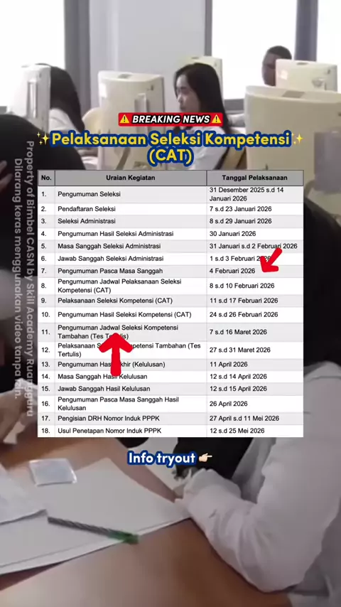 ⚠️ BREAKING NEWS ⚠️ Buat kamu lolos yang lolos seleksi administrasi PPPK Kemenham RI, hari ini merupakan hari pertama seleksi kompetensi yah. Jangan lupa di cek jadwal kamu di hari apa, jam berapa, dan lokasinya dimana. Pelaksanaan seleksi kompetensi dimulai dari 11 sampai 17 Februari 2026. Pastikan juga kalo kamu udah siap buat bertarung mengejar skor tertinggi di seleksi kompetensi PPPK ini yah. Sebelum mulai, yuk tes kemampuan kamu dengan ikut Tryout PPPK di Bimbel CASN by Skill Academy Ruan...