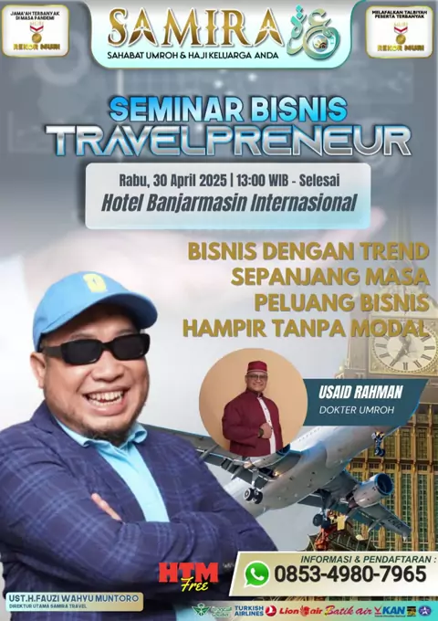 *Undangan Seminar berhadiah Voucher Umroh GRATIS?* Kesempatan langka buat kamu yang rindu Tanah Suci tapi terkendala biaya! *SEMINAR INSPIRASI UMROHKU* Bersama: πŸ§”β€β™‚οΈ *Ust. H. Fauzi Wahyu Muntoro* – Direktur Utama Samira Travel πŸ‘¨β€βš•οΈ *Usaid Rahman* – Dokter Umroh πŸ“… Kamis, 01 Mei 2025 πŸ• 13.00 WITA - Selesai πŸ“ Hotel Banjarmasin Internasional πŸ’Έ *HTM: GRATIS!* *Kamu akan dapat:* βœ… Tips percepatan Umroh meski terkendala biaya βœ… Kisah inspiratif & keajaiban perjalanan Umroh βœ… Ilmu dan peluang