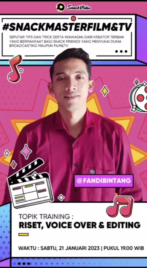 Kemampun menganalisa konten, story telling, voice over hingga editing adalah kunci utama dari membuat konten. Yuk dapatkan semua ilmunya dengan belajar langsung dari LIVE STREAMING #SnackMasterFilm&TV bersama @Fandi Bintang(O150000443127046) pada tanggal 21 Januari 2023 | 19.00 WIB hanya di @SnackVideoOfficial!