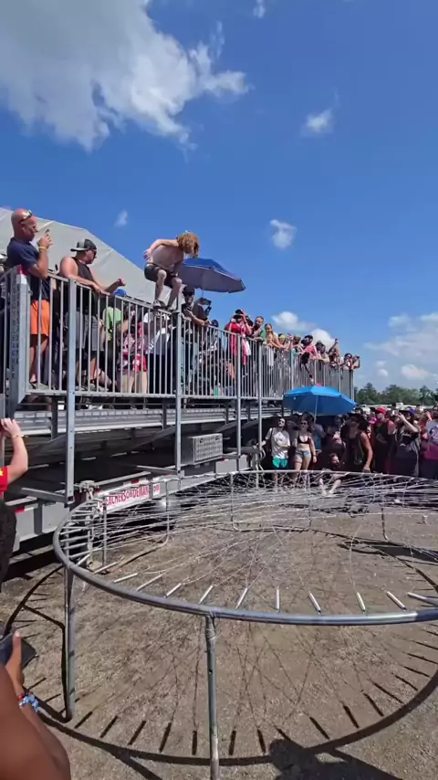 Gathering of the Juggalos 2025 Worlds Most Dangerous Stunt Crew! Front Flip on a barbedwire trampoline. #Dor #KwaiChef2025 #stuntshow #salto #pulo