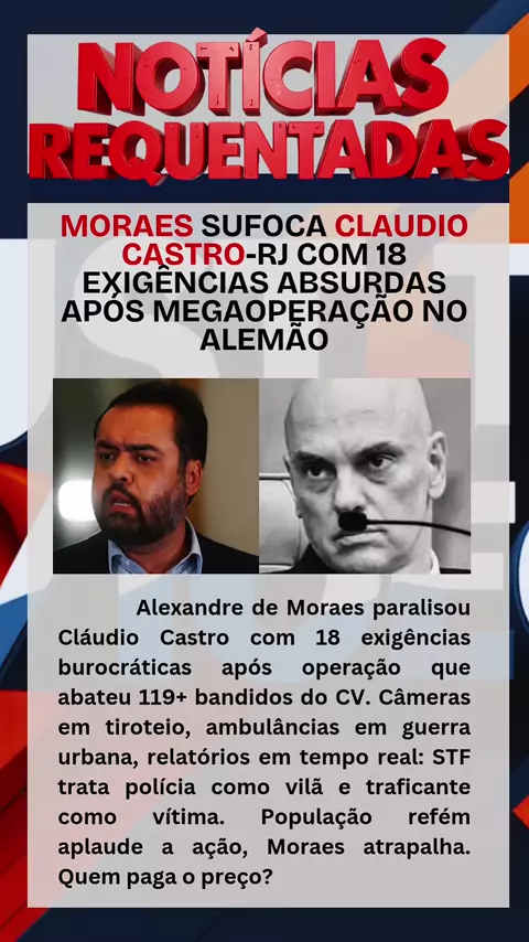 Alexandre de Moraes paralisou Cláudio Castro com 18 exigências burocráticas após operação que abateu 119+ bandidos do CV. Câmeras em tiroteio, ambulâncias em guerra urbana, relatórios em tempo real: STF trata polícia como vilã e traficante como vítima. População refém aplaude a ação, Moraes atrapalha. Quem paga o preço? Choque: Moraes transforma operação histórica contra o CV em circo jurídico, impondo regras impossíveis em plena guerra de fuzis. Segurança pública vira refém do ativismo judicia