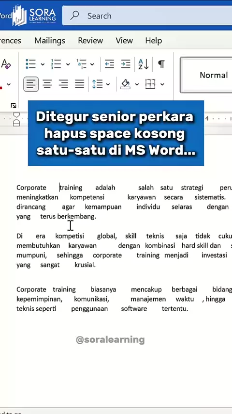 Hapus spasi satu-satu? Itu buang waktu. Pakai fitur find & replace ini buat rapihin space di ms Word. Trik sederhana ini bikin dokumen langsung rapi dalam hitungan detik. 📥 Save dulu, praktik kemudian ➡️ Follow @soralearning untuk tips praktis yang bikin kerja kamu makin cerdas. 𝗦𝗼𝗿𝗮 𝗟𝗲𝗮𝗿𝗻𝗶𝗻𝗴 | Corporate Training • Development Partner#msword#microsofword#kursusexcel##excel