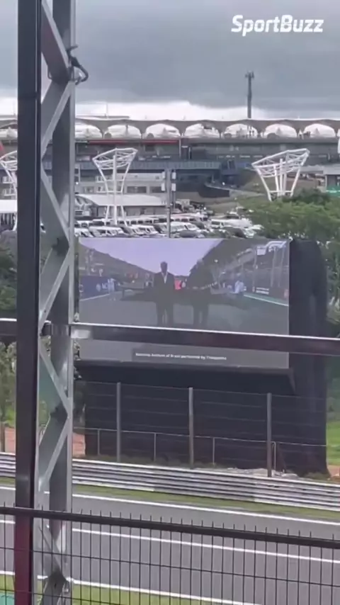 QUE MOMENTHO! 💚💛 Thiaguinho entoando o Hino Nacional Brasileiro em Interlagos! 📽 Reprodução/@estagiariodaf1 #thiaguinho #formula1 #f1 #gpbrasil #gpsaopaulo