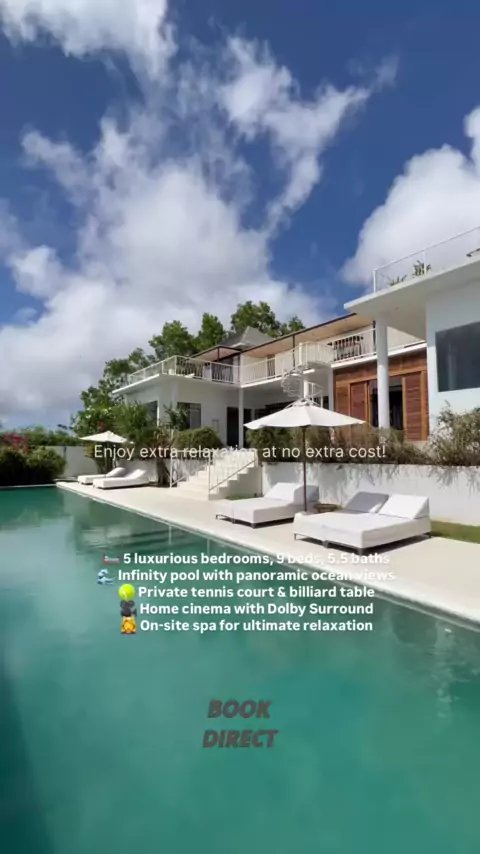 🛏️ 5 luxurious bedrooms, 9 beds, 5.5 baths 🌊 Infinity pool with panoramic ocean views 🎾 Private tennis court & billiard table 🎥 Home cinema with Dolby Surround 💆‍♀️ On-site spa for ultimate relaxation 📅 Book directly to claim this exclusive offer!