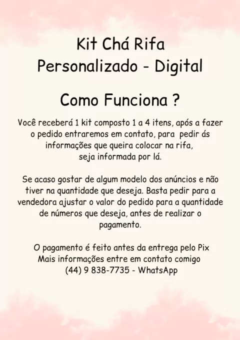 Você receberá 1 kit composto 1 a 4 itens, após a fazer o pedido entraremos em contato, para pedir ás informações que queira colocar na rifa, seja informada por lá. Se acaso gostar de algum modelo dos anúncios e não tiver na quantidade que deseja. Basta pedir para a vendedora ajustar o valor do pedido para a quantidade de números que deseja, antes de realizar o pagamento. O pagamento é feito antes da entrega pelo Pix Mais informações entre em contato comigo (44) 9 838-7735 - WhatsApp