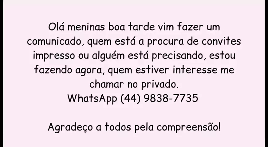 Olá meninas boa tarde vim fazer um comunicado, quem está a procura de convite impresso ou alguém está precisando, estou fazendo agora, quem estiver interesse me chamar no privado. Agradeço a todos pela compreensão!