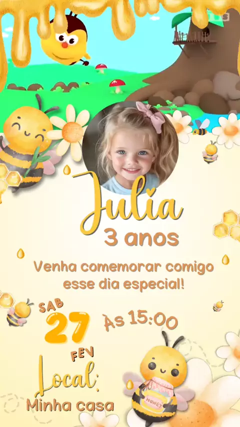 Convite aniversário tema abelhinha personalizada com nome idade local da festa hora envio para todo Brasil via whatsapp.