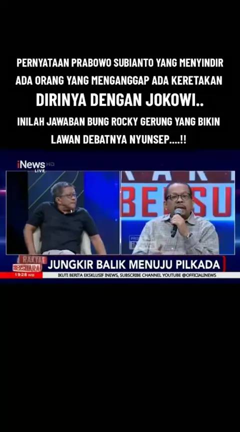 JUNGKIR BALIK MENJU PILKADA. Pernyataan Prabowo Subianto Yang Menyindir Ada Orang Yang Menganggap Dirinya Ada Keretakan Dengan Jokowi.. Namun Inilah Jawaban Bung Rocky Gering Yang Bikin Lawan Debatnya Nyunsep.#debat#rockygerung#rakyatbersuara#aiman#viralllllll#adiannapitupulu#reflyharun#prabowosubianto#update#inews#berita#lagi
