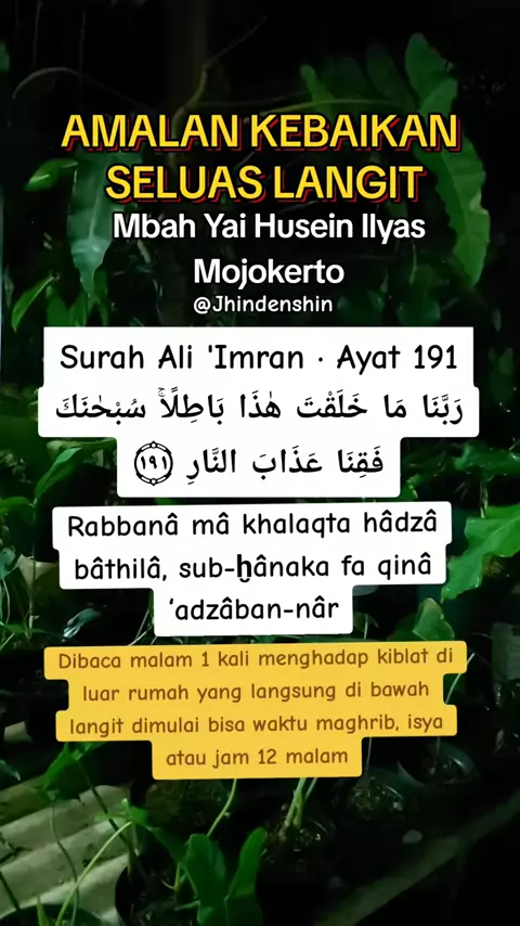 Assalamualaikum🙏 Arti surah tersebut : Ya Tuhan kami, tidaklah Engkau menciptakan semua ini sia-sia. Mahasuci Engkau. Lindungilah kami dari azab neraka. Membaca itu sekali diberikan kebagusannya ibadah dari Malaikat selangit," jelas KH. Husein Ilyas. #Amalan #muslim #