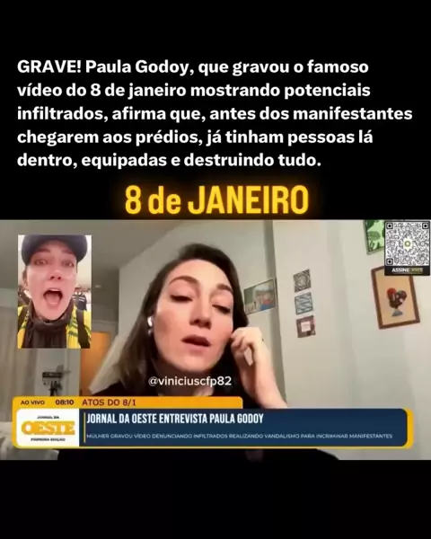 GRAVE! Paula Godoy, que gravou o famoso vídeo do 8 de janeiro mostrando potenciais infiltrados, afirma que, antes dos manifestantes chegarem aos prédios, já tinham pessoas lá dentro, equipadas e destruindo tudo.