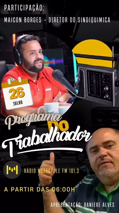Metrópole FM: Participação do Sindiquimica Bahia @sindiquimicabahia no Programa do Trabalhador com entrevista de Maicon Borges @maiconqborges, programa dia 26/07/2025 Curta; Ouça e Compartilhe! @ranierealvesnarrador @queirozjucelia @auingledes @eng.lucasqueirozborges @marcellenascimentto