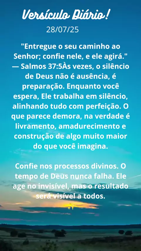 Confie no tempo de Deus e permita que Ele conduza seus passos. Nem tudo acontece na hora que queremos, mas tudo se realiza no momento certo. Tenha fé, respire fundo e continue — o céu está cuidando de cada detalhe. 🙏✨ --- 📌 Hashtags: #MensagemDoDia #VersículoDoDia #FéQueMoveMontanhas #ConfiaENãoDesanima #DeusNoComando