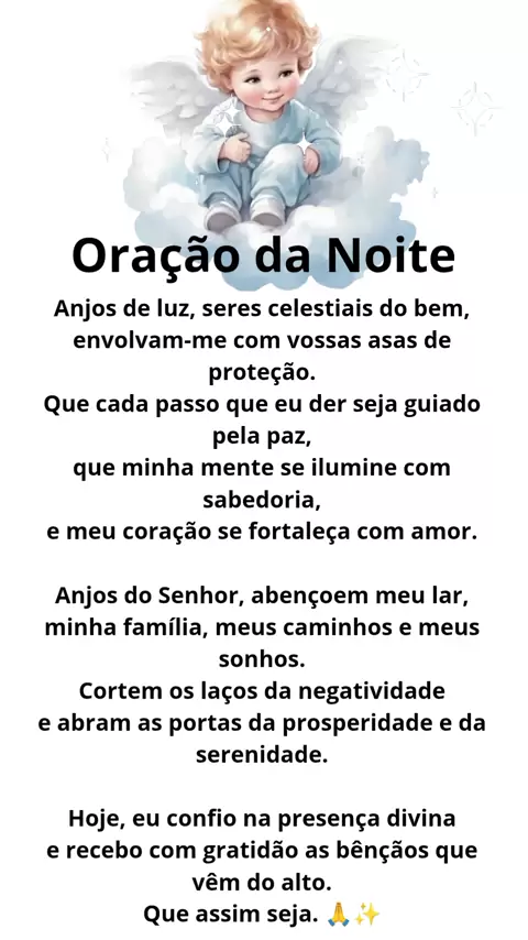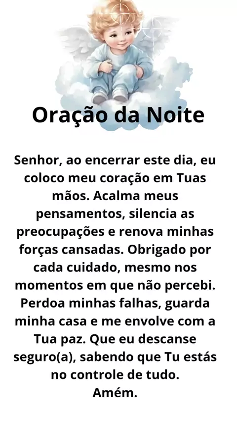 🌙 Oração da Noite 🌙 Divino Criador, ao encerrar este dia, entrego em Tuas mãos tudo o que vivi, senti e pensei. Agradeço pelas bênçãos recebidas, pelos aprendizados e até pelos desafios, pois sei que tudo coopera para o meu crescimento espiritual. Que nesta noite eu seja envolvida(o) por Tua luz, por Teus anjos e guias de proteção. Afasta todo medo, toda angústia e toda energia negativa. Renova minhas forças, acalma meu coração e concede um sono tranquilo e restaurador. Que amanhã eu acorde co