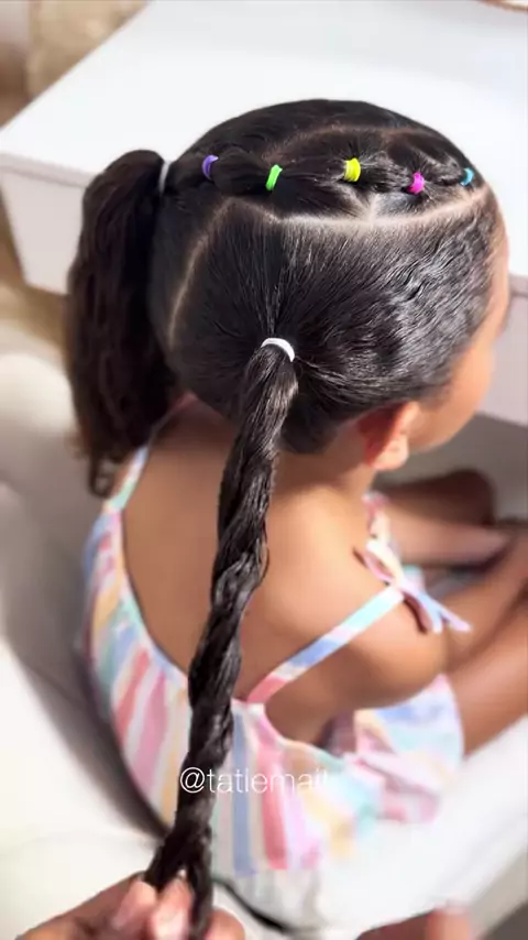 Dia 3 dos 5 penteados escolares 💙💛 Olha o nível dessas trancinhas com elástico colorido + rabo com cachos perfeitos 😮‍💨🎀 Já salva essa inspiração porque amanhã é sua vez! #PenteadoInfantil #maedemenina #mundorosa #VoltaÀsAulas #crespasecacheadas