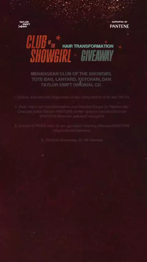 CLUB OF THE SHOWGIRL GIVEAWAY! Dapetin Taylor Swift Indonesia Exclusive Merch dan juga Original CD Taylor Swift dengan buat video transisi terbaik kamu! Caranya gampang banget! Ikuti petunjuk di atas, ya! ⁠3 Most Creative Video : 1 Original CD Taylor Swift + TSID Exclusive Merch (1 Totebag, Lanyard, Keychain) ⁠2 Lucky Swifties : TSID Exclusive Merch (1 Totebag, Lanyard, Keychain) Periode Giveaway 22 - 29 Oktober 2025! Jangan sampai ketinggalan, Showstars!#TaylorSwiftIndonesia#RambutPANTENE