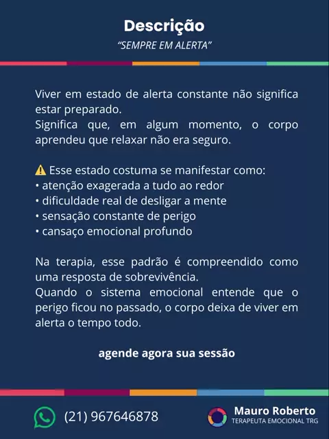 Viver em estado de alerta constante não significa estar preparado. Significa que, em algum momento, o corpo aprendeu que relaxar não era seguro. ⚠️ Esse estado costuma se manifestar como: • atenção exagerada a tudo ao redor • dificuldade real de desligar a mente • sensação constante de perigo • cansaço emocional profundo Na terapia, esse padrão é compreendido como uma resposta de sobrevivência. Quando o sistema emocional entende que o perigo ficou no passado, o corpo deixa de viver......