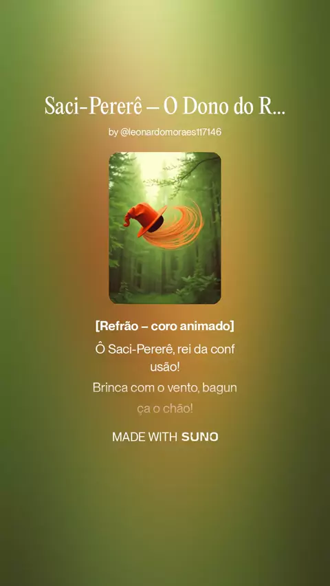 Uma batida folclórica dançante que traz o Saci em sua essência: travesso, livre e encantador. Entre tambores e risadas, o dono do vento transforma bagunça em festa! 🎵🌪️ #Brasil #folclore #suno #SaciPererê #Saci