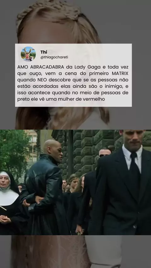 AMO ABRACADABRA da Lady Gaga e toda vez que ouço ela dizer: “Like a poem said by a lady in red You hear the last few words of your life” vem a cena do primeiro MATRIX quando NEO descobre que se as pessoas não estão acordadas elas ainda são o inimigo, e isso acontece quando no meio de pessoas de preto ele vê uma mulher de vermelho na verdade, existe inspiração em comum nisso, a Mulher Escarlate aparece em várias mitologias, até em revelações na bíblia #ladygaga #abracadabra #matrix
