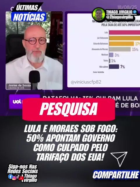 Lula e Moraes Sob Fogo: 50% Apontam Governo como Culpado pelo Tarifaço dos EUA! Pesquisa revela indignação: 50% dos brasileiros culpam Lula (35%) e Moraes (15%) pelo tarifaço dos EUA. Blogueiro destaca derrota do governo, que enfrenta crescente rejeição.