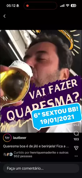 1º SEXTOU BB do Maderite na internet foi esse, exatamente ao mei dia, do dia 15/01/2021. Hoje, oito dias após sua morte, fica minha homenagem, e toda sexta vou postar, na sequência todos os SEXTOU que ele gravou. Hoje serão 5, para igualar a data do carnaval. E assim, vamos eternizando esse cara super alto astral, que passou tão rápido por nossas vidas! Obrigado pela sua alegria Henrique Maderite! #sextoubb #lautbeer #podeolharaipapai #meidia