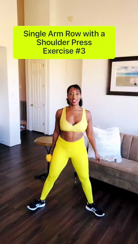 Here is exercise 3. Single arm row with a shoulder press. Swipe to see exercises 1-3. Follow me for #dailyworkouts that you can do from home. #homeworkout #Kwai #fitness