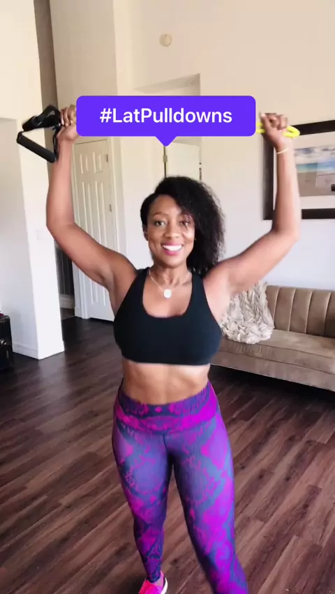 Want to #sculpt your #backmuscles ? Grab and #exerciseband and let’s go to work. Do this pulldown and twist combo for great #upperbody results. Follow me for #dailyworkouts you can do at home.