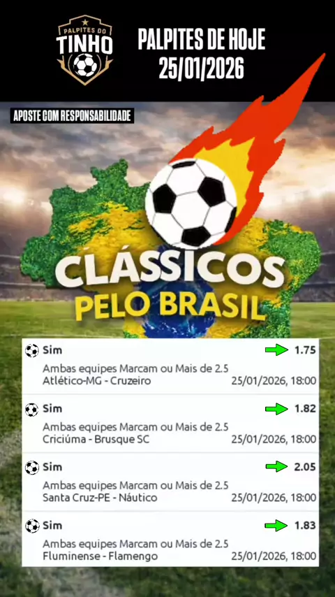 🔥 CLÁSSICOS PELO BRASIL 🔥 Domingão de futebol no 🇧🇷 e 4 Palpites do Tinho 🎯⚽ Mercado de hoje é só no Ambas Marcam ou +2.5 gols! Odds altas, jogos grandes e muito potencial de green 🤑 #kwaifutebol #viralizou #gabigol #bbb26 #neymar