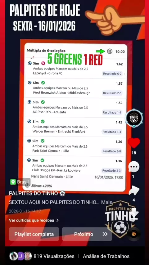 5 Greens 1 Red... 6 Palpites lançados e só um erro ❌️! Se liga... Aqui tem Palpites do Tinho todos os dias! 🫡 #Green #apostas #futebol #Palpites #viral