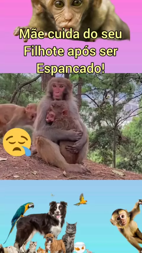 Filhote depois de tomar uma sorra se abriga nos braços da mãe #Macaco #Mae #Filhote #machucado #animais