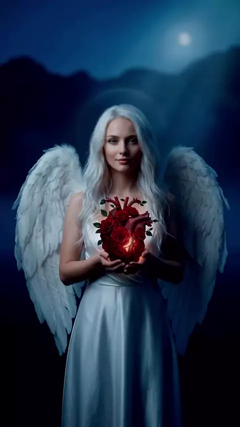 ​"El ángel que sostiene su corazón, transformándolo en una fuente de pétalos, nos recuerda la belleza del desprendimiento. Cada pétalo que cae no es una pérdida, sino la fragante evidencia de un amor que se da sin reservas. Es la lección de que el verdadero corazón no se guarda celosamente, sino que se libera en actos de gracia, floreciendo constantemente para embellecer el camino de los demás."