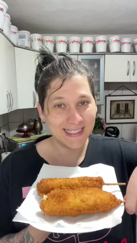 Oii Zentee, Estou postando de novo essa receita maravilhosa pois o que postei não teve um alcance legal 🙁🙁 Esse salgado é conhecida como CORNDOG COREANO e é uma delícia , é intercalado no palito queijo e salsicha depois é envolvido em uma massa saborosa e depois empanado na farinha PANKO depois frito em Gordura quente , o recheio da massa consiste em : 2 ovos 2 xícaras de farinha 1 xícara de leite 2 colheres de açúcar 1 pitada de sal 1 colher de fermento #receitas #topz