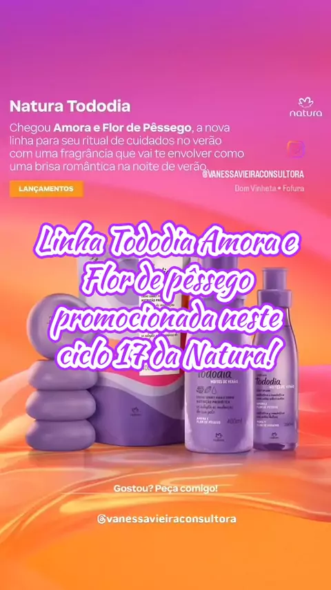 Os lançamentos da linha Tododia Amora e Flor de Pêssego chegaram em promoção neste Ciclo 17 da Natura! 💖🍑 Fragrância delicada, textura incrível e cuidado que nutre a pele todos os dias — perfeita para quem ama frescor, conforto e aquele toque doce na rotina. 🌿💫 💬 Aproveite para conhecer e se apaixonar por essa novidade deliciosa! Link na minha bio. ✨ #Lançamentos #Tododia #AmoraeFlordePessego #Natura #Ofertas