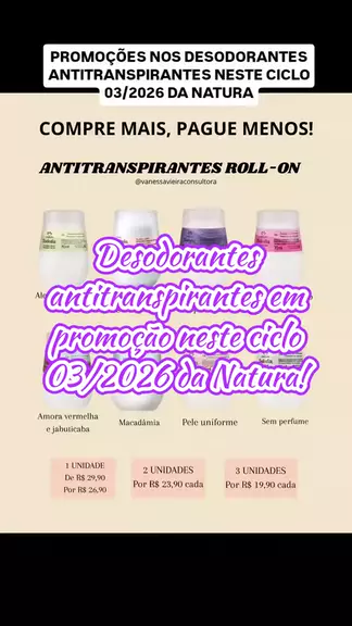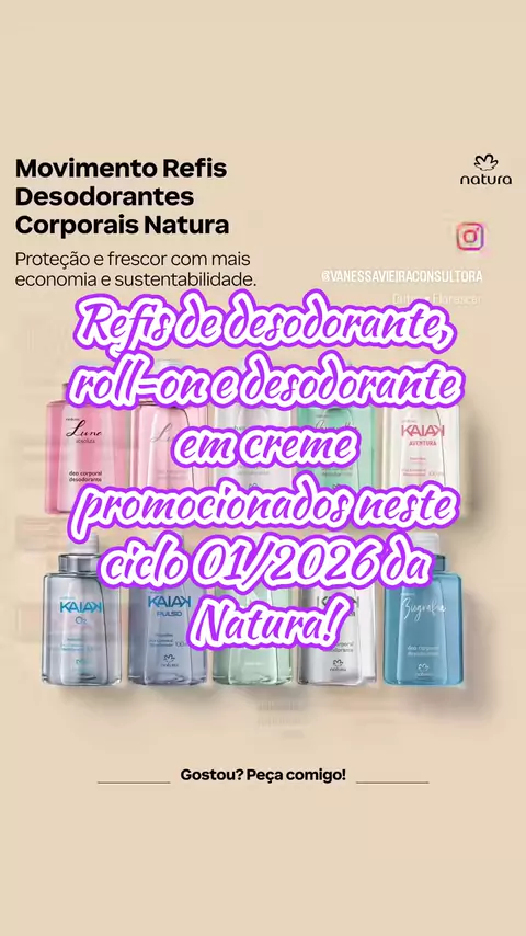 💙 Promoções Natura – Ciclo 01/2026 💙 Economia e cuidado que duram mais! Refis de desodorantes corporais Luna, Kaiak, Biografia e Sr. N com preços especiais, além dos roll-ons Tododia nas fragrâncias Acerola e Hibisco, Amora e Flor de Pêssego, e Manga Rosa e Água de Coco. Complemente com o desodorante em creme Manga Rosa e Água de Coco e garanta proteção e frescor todos os dias! 🌸🍃 Link na minha bio. ✨ #Ciclo01 #Natura #RefildeDesodoranteCorporal #Rollon #Ofertas