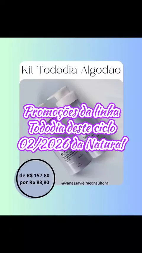 🩵✨ Tododia em promoção – Ciclo 02/2026 ✨🩵 Autocuidado que abraça a pele! Kit com 2 hidratantes de algodão, creme de mãos de algodão, sabonete esfoliante e gel de banho energizantes, sabonete líquido em gel e sabonetes em barra de alecrim e sálvia e sabonetes de algodão com preços especiais. Hora de renovar seus cuidados diários com cheirinho delicioso e pele macia todos os dias! 🌿🛁💆‍♀️ Link na minha bio. ✨ #Ciclo02 #Natura #Ofertas #Tododia #VanessaVieiraConsultora
