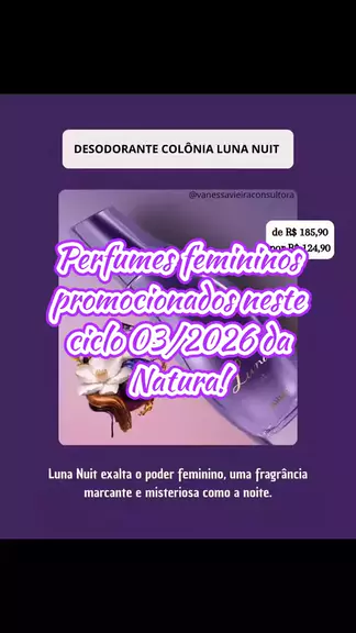 ✨ Perfumaria Feminina em Promoção – Natura Ciclo 03/2026 ✨ É a sua chance de se perfumar com elegância e personalidade pagando menos! 💐💕 Tem o encanto envolvente de Luna Nuit, a sofisticação de Essencial Exclusivo, o carinho do Presente Ilia Ser e a conexão com a natureza em Ekos Ryo Floresta, Castanha e Açaí. Fragrâncias marcantes para todos os estilos — aproveite antes que acabe! 🌿✨ Link na minha bio. ✨ #Ciclo03 #Natura #PerfumeFeminino #Ofertas #VanessaVieiraConsultora