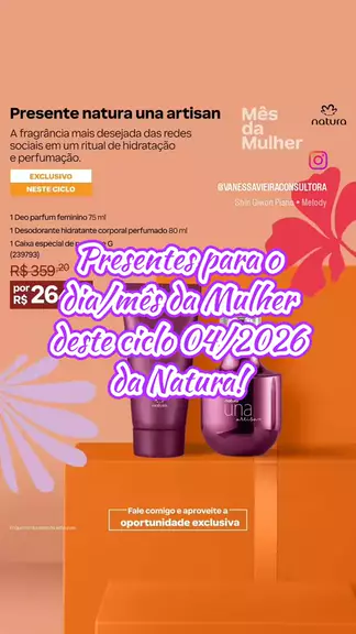 🌸✨ Presentes para o Dia da Mulher – Ciclo 04/2026 da Natura! ✨🌸 Celebre a força, a beleza e a essência de cada mulher com os presentes especiais da Natura! 💖 Kits encantadores, fragrâncias marcantes e cuidados cheios de carinho com preços promocionais para tornar essa data ainda mais especial. Garanta já o presente perfeito! 💐🎁 Link na minha bio. #Presente #Ciclo04 #Natura #Ofertas #VanessaVieiraConsultora