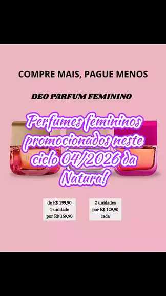 ✨🌸 Perfumaria Feminina em Promoção – Ciclo 04/2026 da Natura ✨🌸 É hora de se perfumar com elegância e personalidade com as ofertas da Natura! 💖 Neste ciclo, aproveite os preços especiais de Ilía Laços, Ilía Plena, Ilía, Essencial Oud, Essencial Único, Luna Absoluta, além das fragrâncias naturais de Ekos Pitanga e Ekos Açaí (75ml), Ekos Maracujá Natureza dos Sonhos, bodysplash de Tâmara e Canela, colônia Festival de Humor e Desodorantes corporais + refis do Biografia e Kaiak. #Ciclo04 #Natura