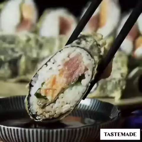 Easy Tempura Sushi ⁠⁣ 🎥: @tastemade_japan⁠⁣ ⁣ Ingredients:⁠⁣ 2 cups cooked rice⁠⁣ 4 greens⁠⁣ 5 ounces tuna⁠⁣ 5 ounces salmon⁠⁣ 4 sheets of nori⁠⁣ Oil, for frying⁠⁣ Flour⁠⁣ Tempura batter⁠⁣ ⁠⁣ Steps: ⁠⁣ 1. Lay a bed of cooked rice on the inside of the rice roll shaker. Place the greens, tuna and salmon, and cover them with more cooked rice. Close the cover of the rice roll shaker and shake it about 20 times.⁠⁣ 2. Add the nori and shake it more.⁠⁣ 3. Heat a pot of oil to 350 degrees.⁠⁣ 4. Take o...