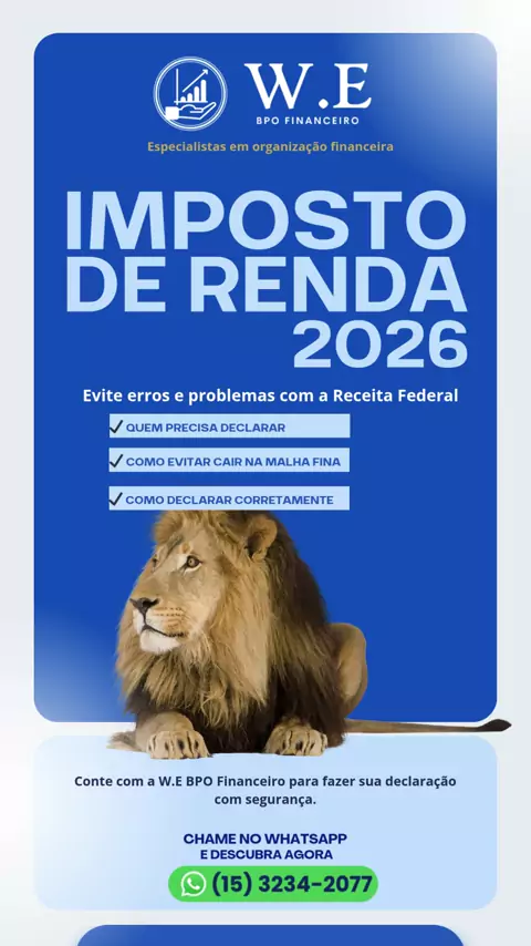 Saiba Mais. Whatsapp: https://wa.me/551532342077 Siga nosso Instagram: https://instagram.com/we_bpo_finance #ImpostoDeRenda2026 #DeclaraçãoDeImpostoDeRenda #DicasDeIR #ImpostoDeRendaSimples #DeclaraçãoIR