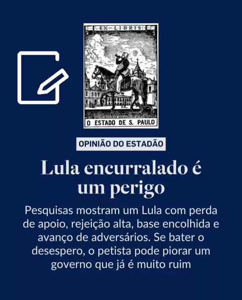 🚨 Giro Político | Editorial Estadão. Lula encurralado é um perigo ⚠️🔥 "A mais recente pesquisa Atlas/Bloomberg espalhou brasas onde já havia muito fogo 🔥 nas aflições do presidente Luiz Inácio Lula da Silva em sua ambição pela reeleição. Se era nítida a preocupação com a queda na aprovação 📉, o avanço da desaprovação e o pessimismo crescente dos brasileiros 😟, o novo levantamento reafirma a consolidação do senador Flávio Bolsonaro (PL) na disputa 💪 e, mais do que isso, expõe um presidente