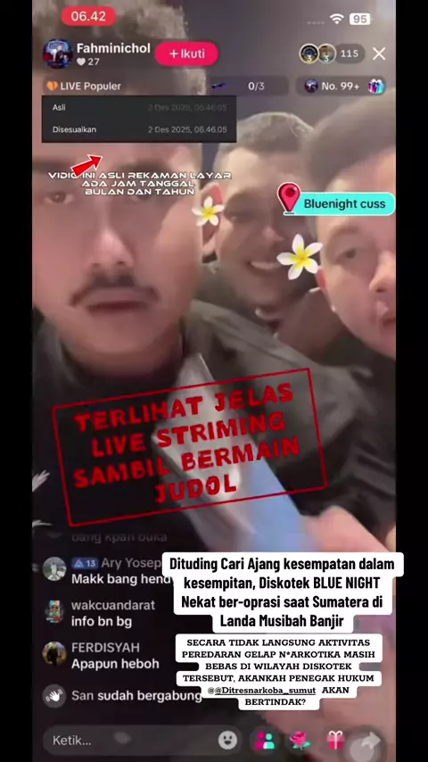 BINJAI - Sebuah video viral kembali mengusik rasa keadilan publik di Sumatera Utara. Dalam unggahan akun @BINJAI_STORY70, terlihat aktivitas di Tempat Hiburan Malam (THM) Blue Night Lounge dan Bar, Jalan Emplasmen, Kwala Mencirim, Kecamatan Sei Bingei, Kabupaten Langkat, kembali berjalan. Padahal, lokasi itu sebelumnya sudah disegel aparat. Video bertanggal 13 Desember 2025 itu memperlihatkan pintu masuk Blue Night terbuka. Pengunjung tampak keluar-masuk seperti malam biasa, seolah tak p...